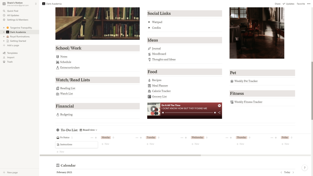 This is a template for your Life Wiki. You can use it as a home page to track all elements of your day to day life, as well as keep you on track for your more long term goals. It has numerous elements that make it perfect for a student from any walk of life, and even a working professional with a passion for aesthetics. Besides a gorgeous, cohesive theme, it contains many features, like:
